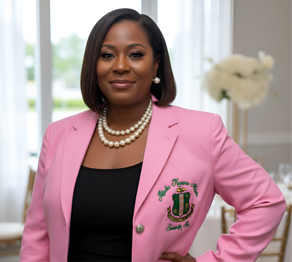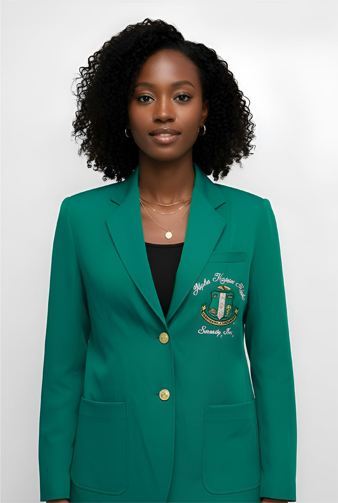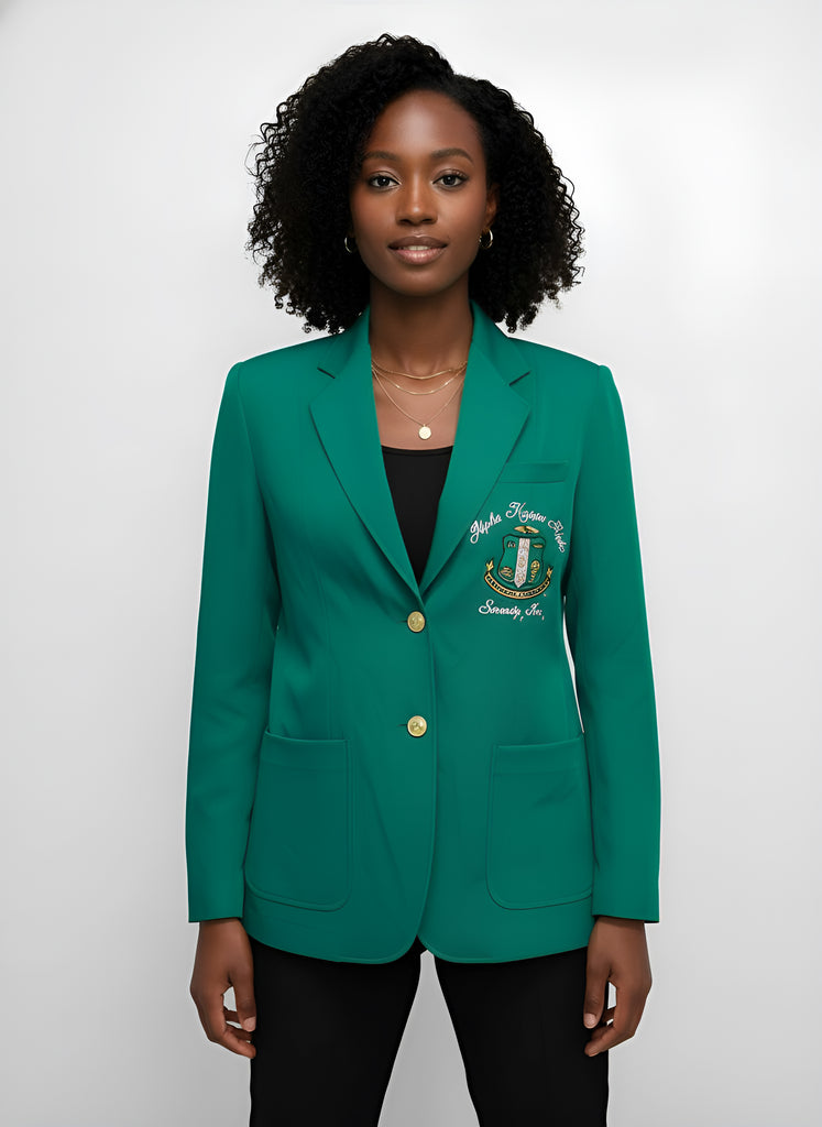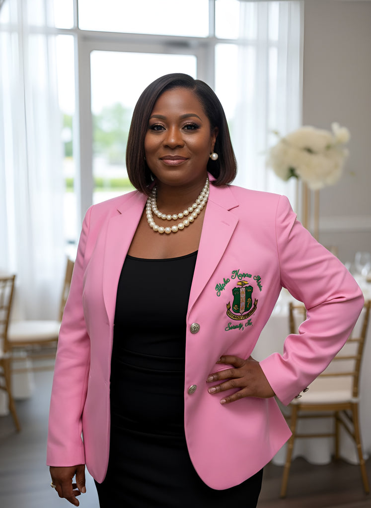 Elevate your sorority style with the Alpha Kappa Alpha Traditional Crest Blazer, a timeless piece designed for women who embody leadership, legacy, and sisterhood. Available in both classic pink, black and Kelly Green, this blazer is the perfect blend of elegance, comfort, and tradition.