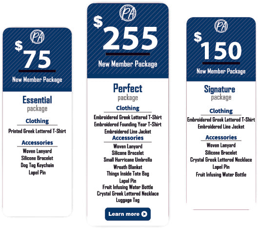 New member packages for members of Zeta Phi Beta Sorority, Incorporated. There are three package levels to select from the Essential, Signature, and Perfect packages. We combined the most popular items that new members purchase and created a cost-saving package.