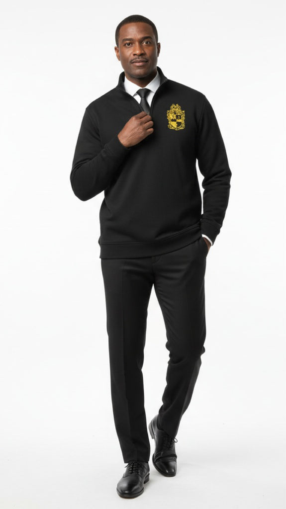 Introducing the Alpha Phi Alpha Premium Quarter Zip, where classic style meets fraternity pride. This elegant pullover, crafted by Brooks Brothers, combines top-tier comfort and durability. The deep black hue adds a sophisticated touch, making it perfect for various occasions.