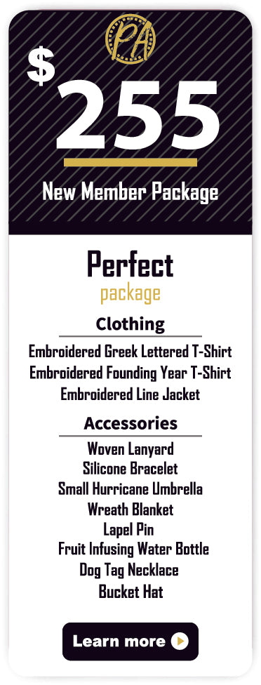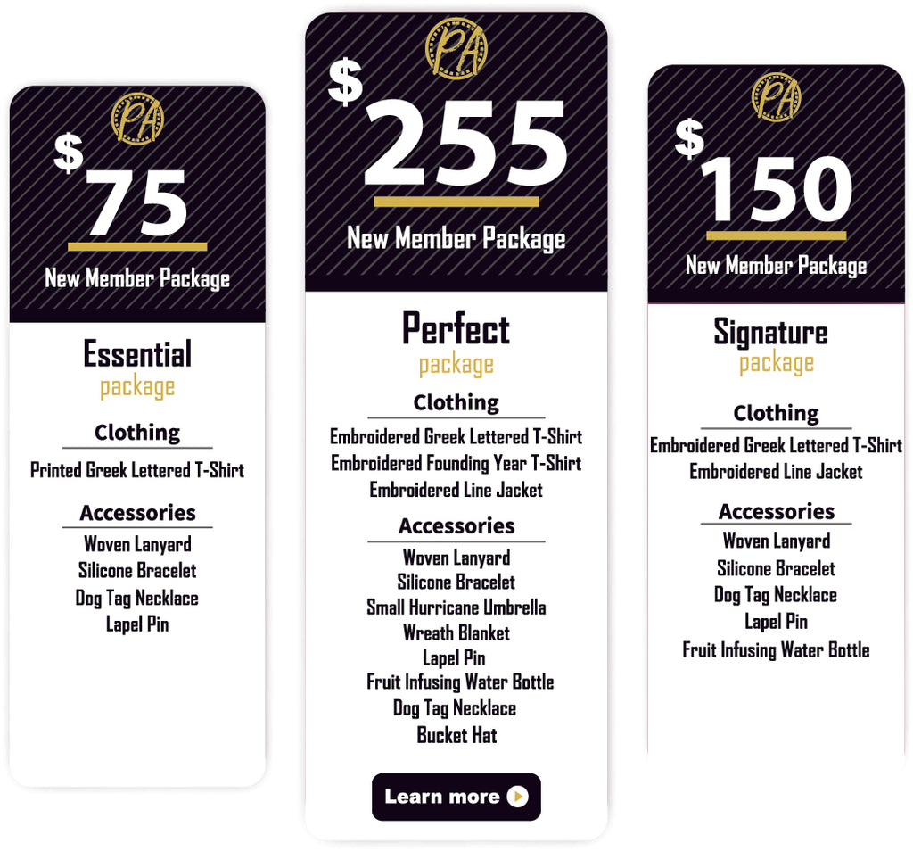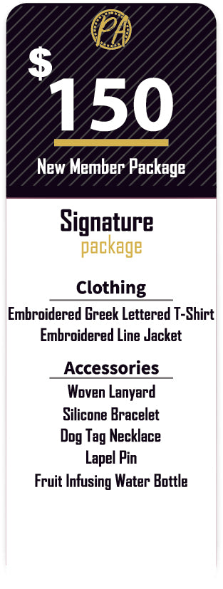 New member packages for members of Alpha Phi Alpha Fraternity, Incorporated. There are three package levels to select from the Essential, Signature, and Perfect packages. We combined the most popular items that new members purchase and created a cost-saving package.